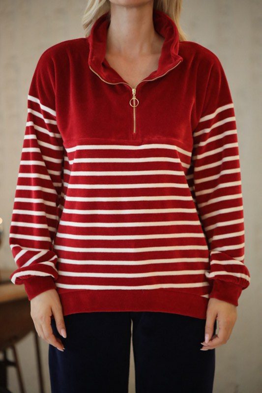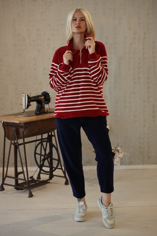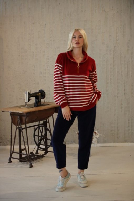 Bordo Çizgili Fermuarlı Sweatshirt