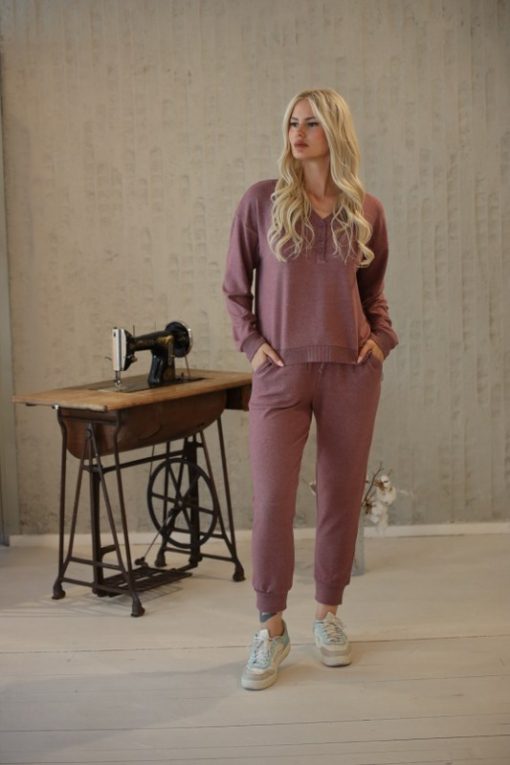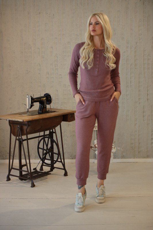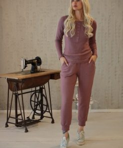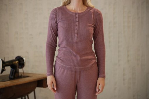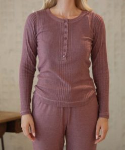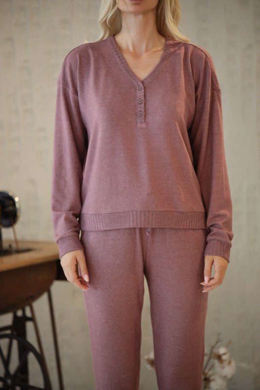 Lila V Yaka Düğmeli Uzun Kollu Tişört